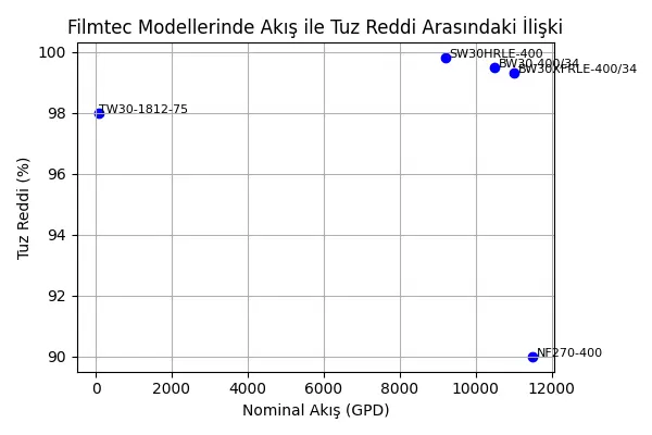 Grafikte, farklı Filmtec modellerinin nominal akışı ve tuz reddi arasındaki ilişkiyi görebilirsiniz. Daha yüksek akış genellikle daha yüksek basınç ve görece düşük reddi gerektirir; buna karşın SW30HRLE serisi yüksek tuz reddini yüksek akışla birleştirerek dikkat çeker. Tasarım sürecinde bu dengeyi doğru kurmak, hem işletme maliyetlerini hem de su kalitesini optimize eder.